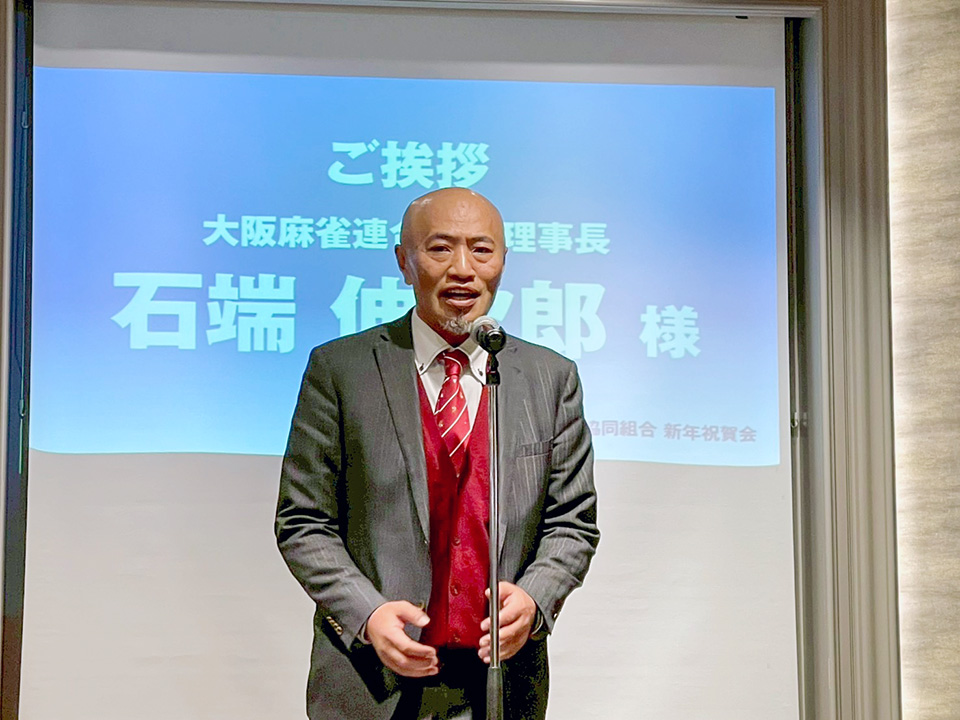 また、途中には上部団体の全国麻雀業組合総連合会・特別顧問で警視庁OBの勝俣茂様と、大阪麻雀連合会・石端伸次郎理事長よりご挨拶を頂戴しました。