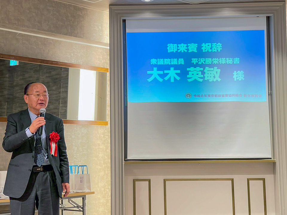 1月15日(木)、港区赤坂「マリーグラン赤坂」にて、「令和8年東京都麻雀業協同組合新年祝賀会」を開催し、業界関係者や組合員にご参加いただきました。